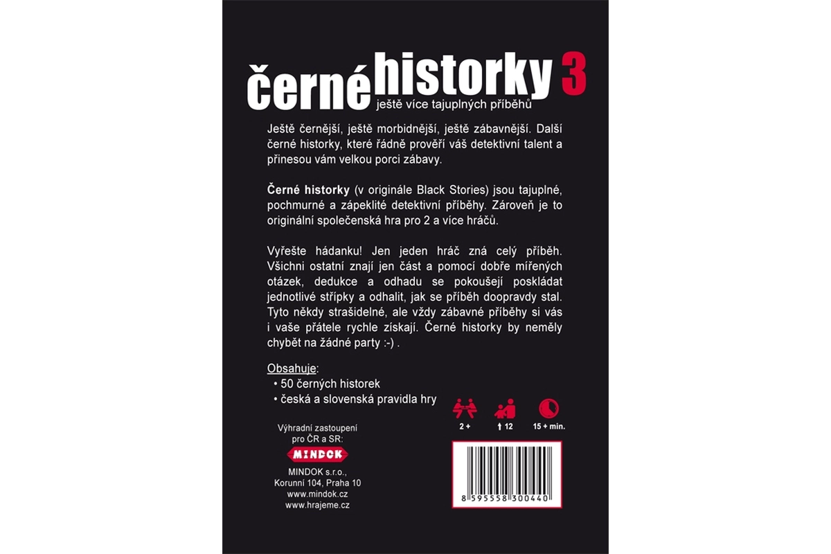 Czarne historie 3 przynoszą jeszcze czarniejsze, bardziej makabryczne i zabawniejsze historie, które zarówno rozbawią, jak i porządnie rozruszają twoje szare komórki. Jeden gracz zna cały przypadek, pozostali za pomocą pytań, dedukcji i logiki próbują poskładać fragmenty i rozwikłać zagadkę. Idealne na wieczory ze znajomymi, rodzinne spotkania oraz jako lodołamacz na imprezie.