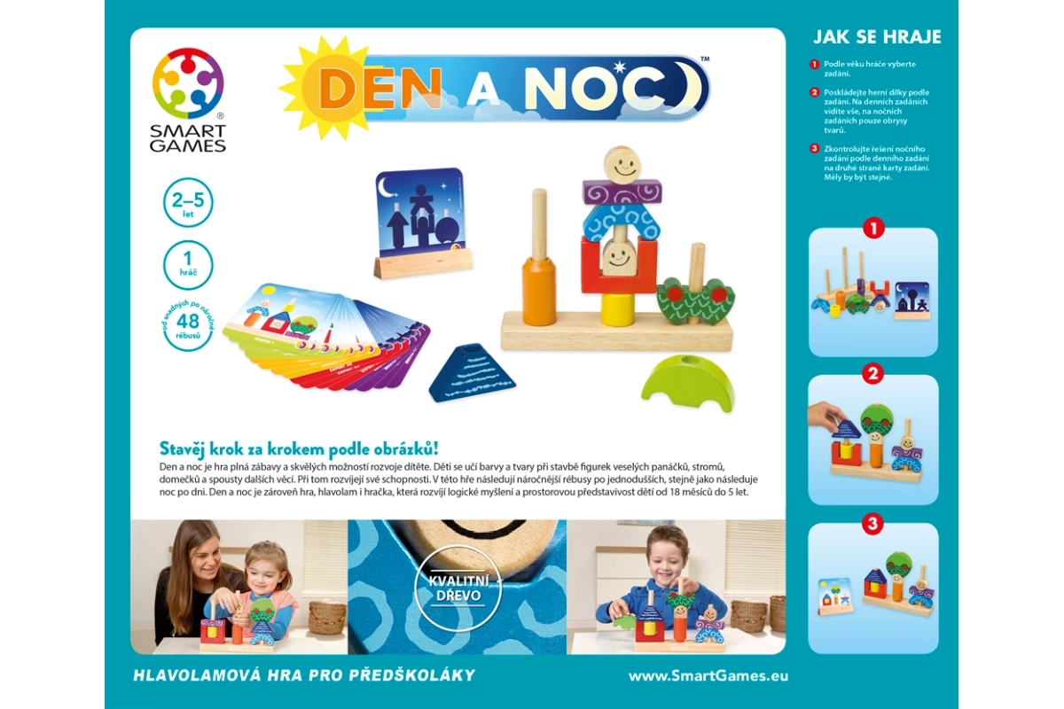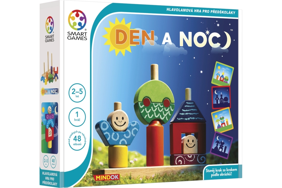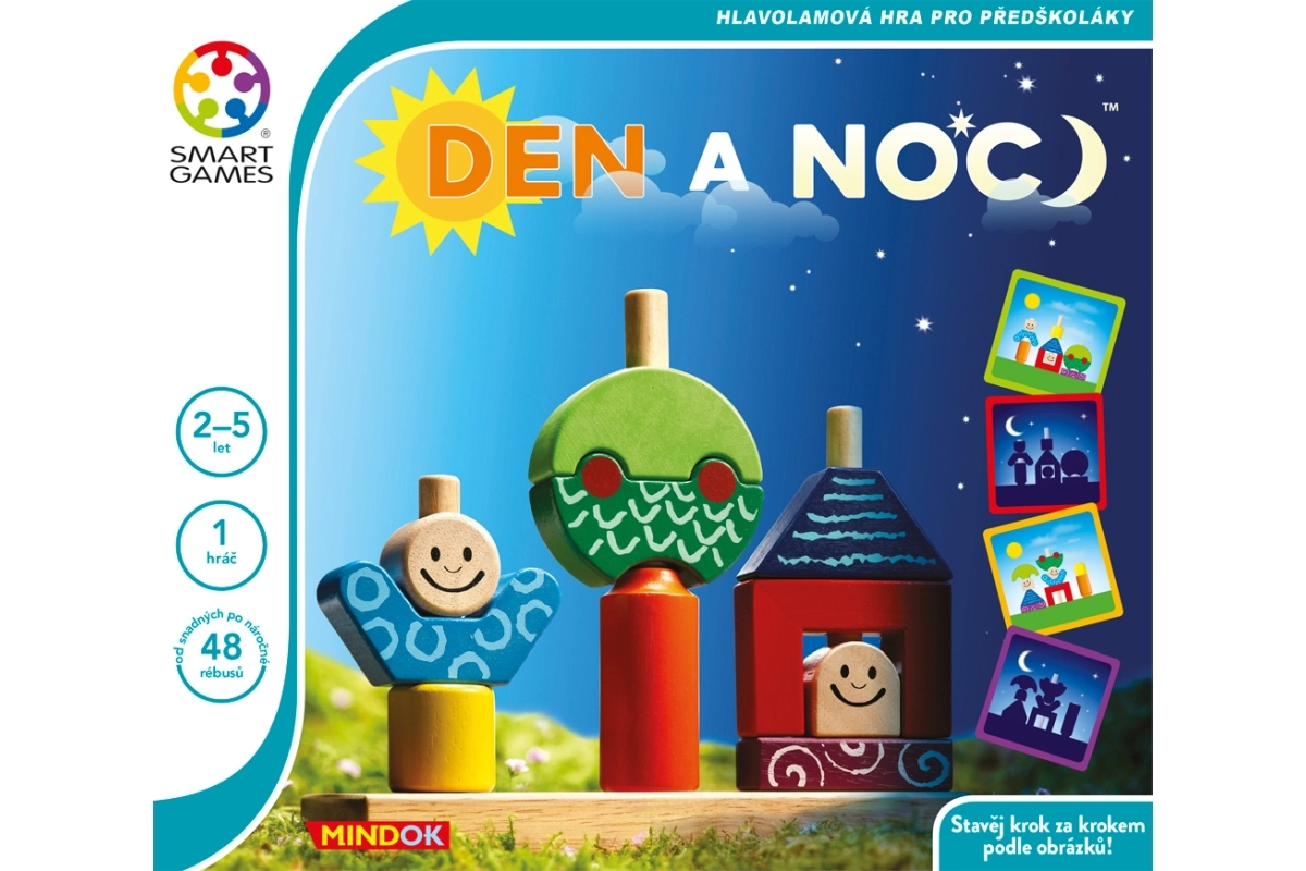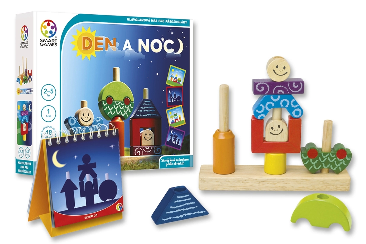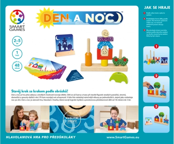 Odkryj magię gry Smart Games Dzień i noc – sprytną zabawkę, która łączy logiczne łamigłówki, naukę kolorów i kształtów oraz rozwój wyobraźni przestrzennej. Dzieci od 18 miesięcy układają wesołe postacie, drzewa i domki według zadań, które płynnie przechodzą od prostszych dziennych do trudniejszych nocnych rebusów.