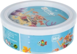 Okrągły pojemnik jako improwizowane akwarium oraz 22 morskie stworzenia z magnesami zapraszają do zabawy, która rozwija koordynację i wyobraźnię.
