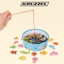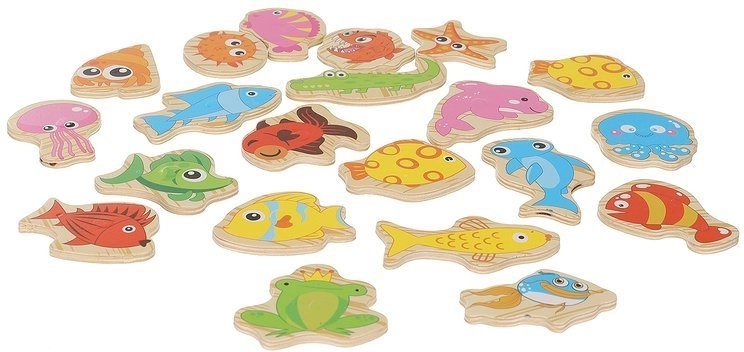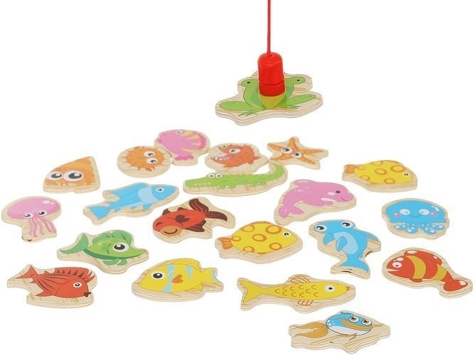 Zestaw zawiera wszystko, co potrzebne: 22 drewniane zwierzątka z magnesem, 2 drewniane wędki oraz okrągły pojemnik, który posłuży jako „akwarium”. Bezpieczne, gładkie krawędzie i przewaga naturalnego materiału, jakim jest drewno, czynią z niego bezpieczną i trwałą zabawkę dla dzieci od 3 lat. Doskonały do zabawy indywidualnej i grupowej, rozwoju komunikacji i współpracy.