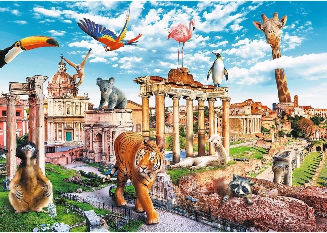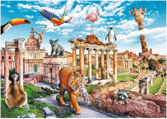 Oryginalna ilustracja łączy rzymskie zabytki i egzotyczne zwierzęta. Zabawny, pełen detali obraz przykuwa uwagę, a układanie spodoba się całej rodzinie.