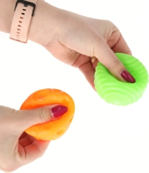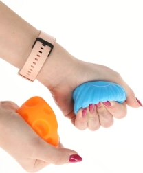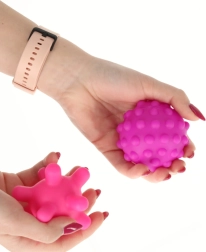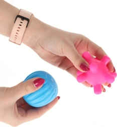 Piłeczki nadają się do zabawy na sucho i w wodzie. Faktury sprawdzają się przy delikatnym masażu dłoni i stóp, przynosząc ukojenie.
