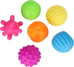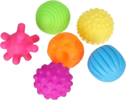 Każda piłeczka ma unikalną powierzchnię (małe i duże wypustki, żebrowanie, rowki, „jeżyk”), która wspiera zmysł dotyku i ciekawość dziecka.