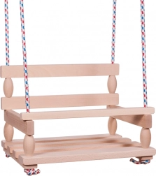 Ta naturalna drewniana huśtawka wniesie radość z bujania do Twojego ogrodu, na taras lub do pokoju dziecięcego w klasycznym, ponadczasowym stylu. Solidna drewniana konstrukcja z zaokrąglonymi elementami i barierkami bezpieczeństwa daje pewność także młodszym dzieciom, a przestronne siedzisko 40 × 30 cm zapewnia komfort przy każdym ruchu.