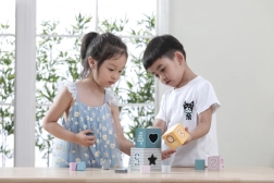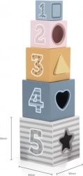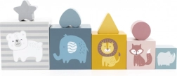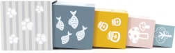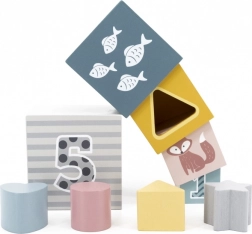 - 5 pudełek o różnych rozmiarach i 4 geometryczne klocki