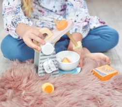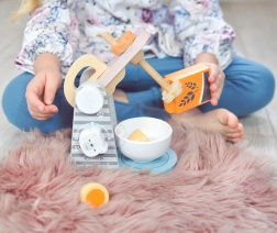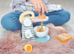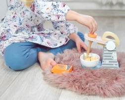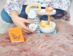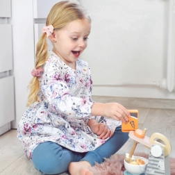 Ten różowo-szary mikser z odchylanym ramieniem i stylowymi elementami wzorniczymi pozwala dzieciom odgrywać role i naśladować umiejętności kucharskie. Mikser ma praktyczny uchwyt, dzięki czemu dzieci mogą łatwo włożyć lub wyjąć miskę, co wspiera ich zdolności motoryczne.