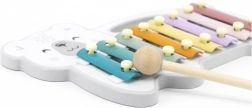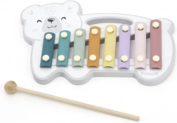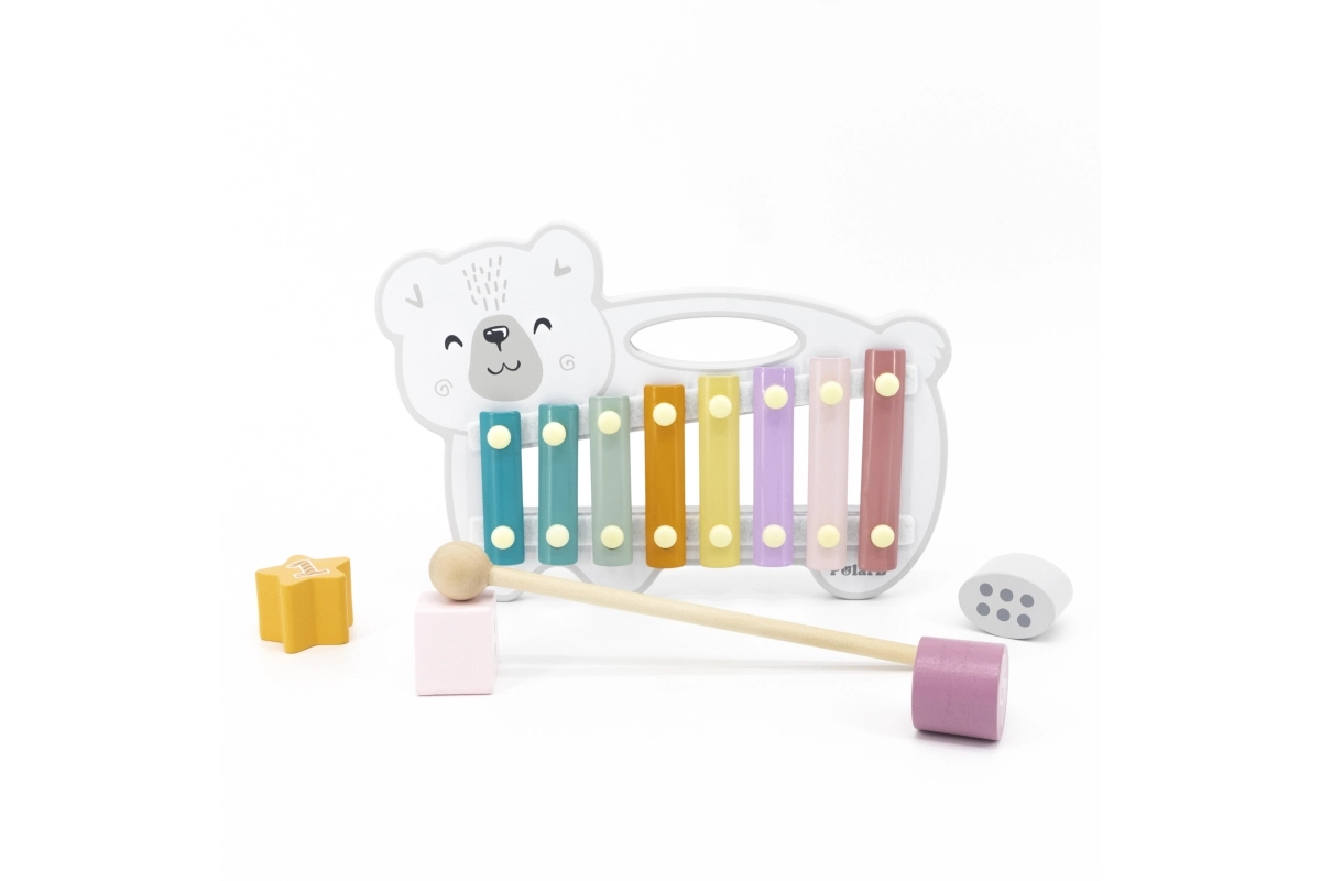 Drewniany ksylofon w kształcie niedźwiedzia polarnego łączy zabawną estetykę z funkcjonalnym instrumentem muzycznym. Pastelowo kolorowe metalowe listwy tworzą przyjemne tony po uderzeniu drewnianą pałeczką, naturalnie zachęcając dzieci do eksperymentowania z dźwiękami i rytmem.