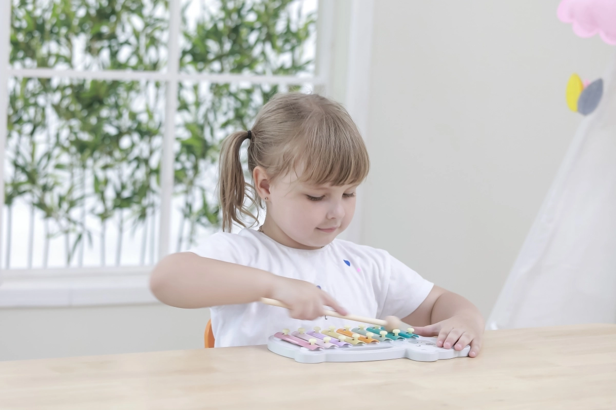 Osiem pastelowych klawiszy zachęca dzieci do odkrywania tonów, rytmu i prostych melodii. Idealny do rozwoju percepcji słuchowej i kreatywności.