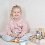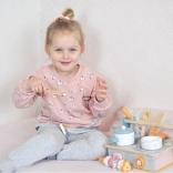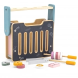 W zestawie jest wszystko, czego potrzeba do pierwszych przepisów: dwa garnki i podstawowe przybory (nóż, łyżka, łopatka, szczypce), patyczki do szaszłyków oraz drewniane produkty, takie jak mięso, jajka i warzywa. Kolorowe wykonanie zachęca do zabawy i wspiera rolę małego kucharza.
