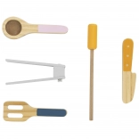 Dwa garnki, nóż, łyżka, łopatka, szczypce, patyczki do szaszłyków oraz drewniane produkty (mięso, jajka, warzywa) wspierają pomysłową zabawę w odgrywanie ról bez dodatkowych zakupów.