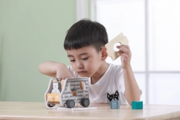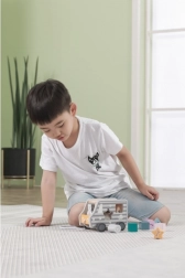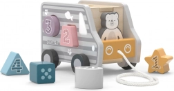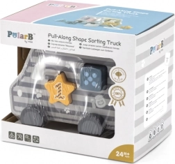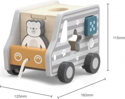 Drewniana ciężarówka do ciągnięcia i układanka w kształcie samochodu ciężarowego. Wymiary ok. 18 × 12 × 6,5 cm. Wymiary opakowania ok. 19 × 16,5 × 13,5 cm. Wiek 18 m+.