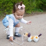 Uroczy drewniany piesek na sznurku wspiera pierwsze kroki, rozwija małą motorykę i koordynację, a dzięki gumowym kółkom o cichym biegu idealnie sprawdza się w mieszkaniu. Ze sznurkiem do prowadzenia i radosnym merdającym ogonkiem to świetny prezent dla małych odkrywców.
