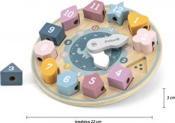 Wyraźnie czytelne cyfry, oznaczenia kropkami do wizualnego liczenia oraz pastelowe kolory wspierają rozwój umiejętności przedszkolnych. Drewno bukowe i nietoksyczne farby zapewniają bezpieczeństwo i długą żywotność. Zabawka motywuje do samodzielnego odkrywania i oferuje wiele sposobów zabawy – od układania liczb 1–12, przez dopasowywanie kształtów, po pierwsze kroki w określaniu czasu.