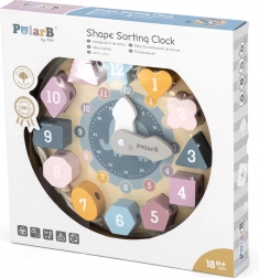Drewniany zegar dla dzieci POLARB łączy sorter kształtów, układanie liczb i nawlekanie w jednej wszechstronnej, edukacyjnej zabawce. Dwanaście ponumerowanych elementów w kształcie figur geometrycznych wkłada się w odpowiadające im wycięcia na tarczy, a ruchome wskazówki uczą dzieci rozumienia godzin. Każdy element ma otwór do łatwego przewlekania sznurkiem, co naturalnie rozwija małą motorykę i koncentrację.