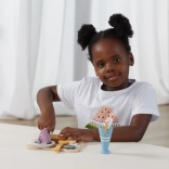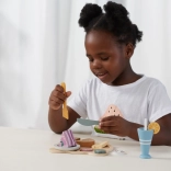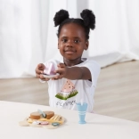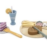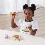 Kolorowe kawałki jedzenia, deser i napój pozwalają dzieciom serwować obiad jak naprawdę i ćwiczyć podstawy nakrywania do stołu.