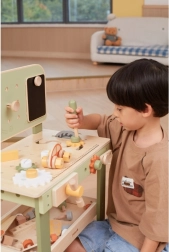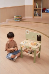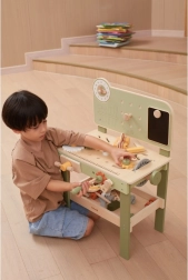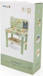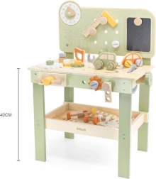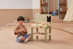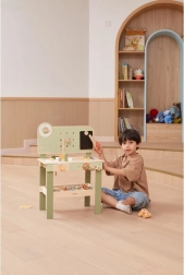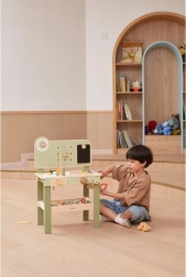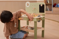 Stylowy dziecięcy warsztat w naturalno-zielonej kolorystyce oferuje realistyczne doświadczenie pracy w warsztacie w bezpiecznej, drewnianej formie. Dzieci mogą przykręcać, wymieniać kółka w autku, „ciąć” elementy, składać koła zębate i odkrywać zasady przyczyny i skutku. Dzięki przejrzystej przestrzeni do przechowywania wszystkie elementy i narzędzia są zawsze pod ręką.