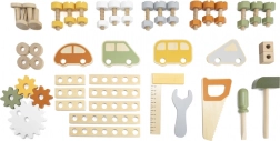 Zabawa warsztatem wspiera małą motorykę, koordynację ręka–oko, logiczne myślenie oraz kreatywność. Drewniane wykonanie jest trwałe i przyjemne w dotyku, dzięki czemu nadaje się do codziennej zabawy w domu i w przedszkolu.
