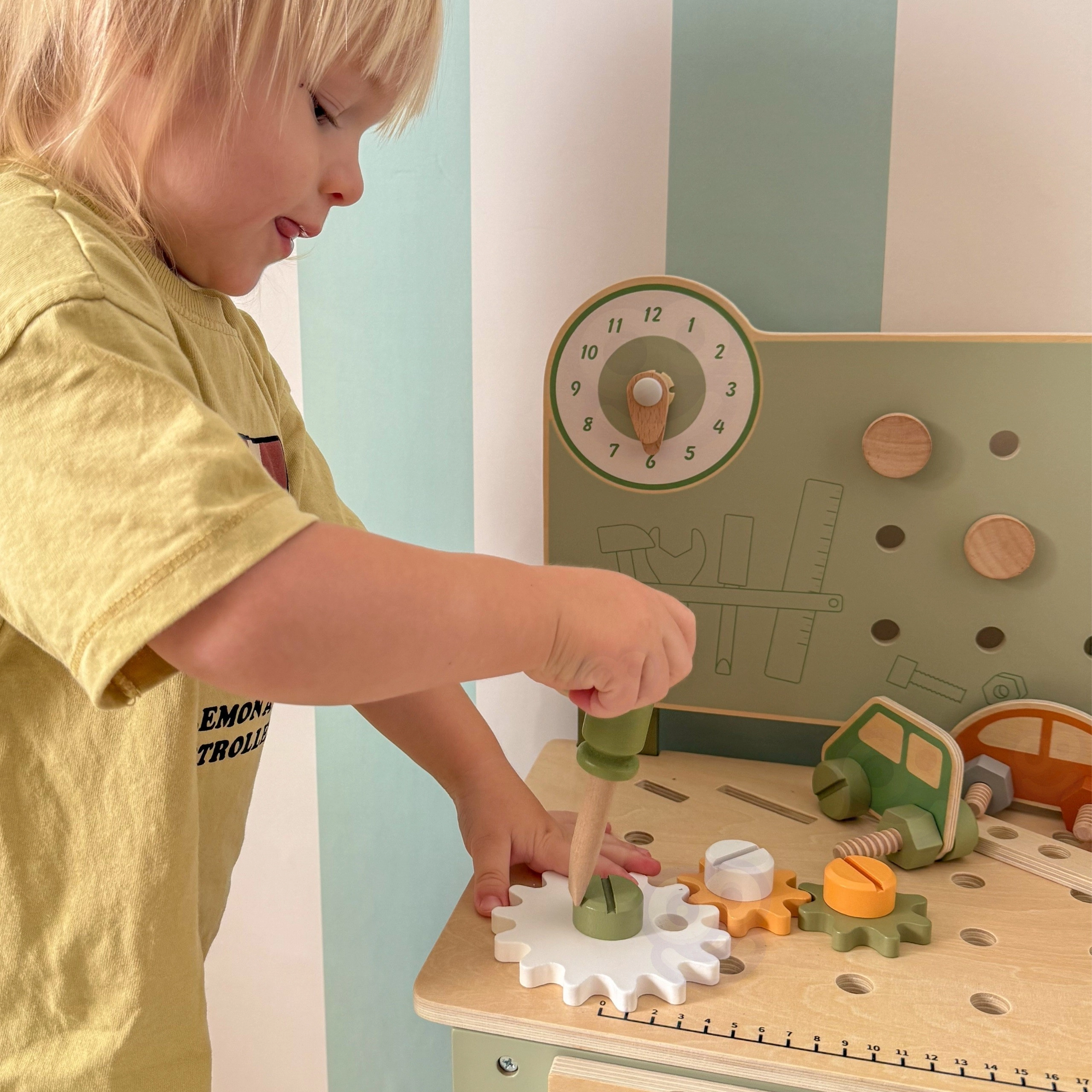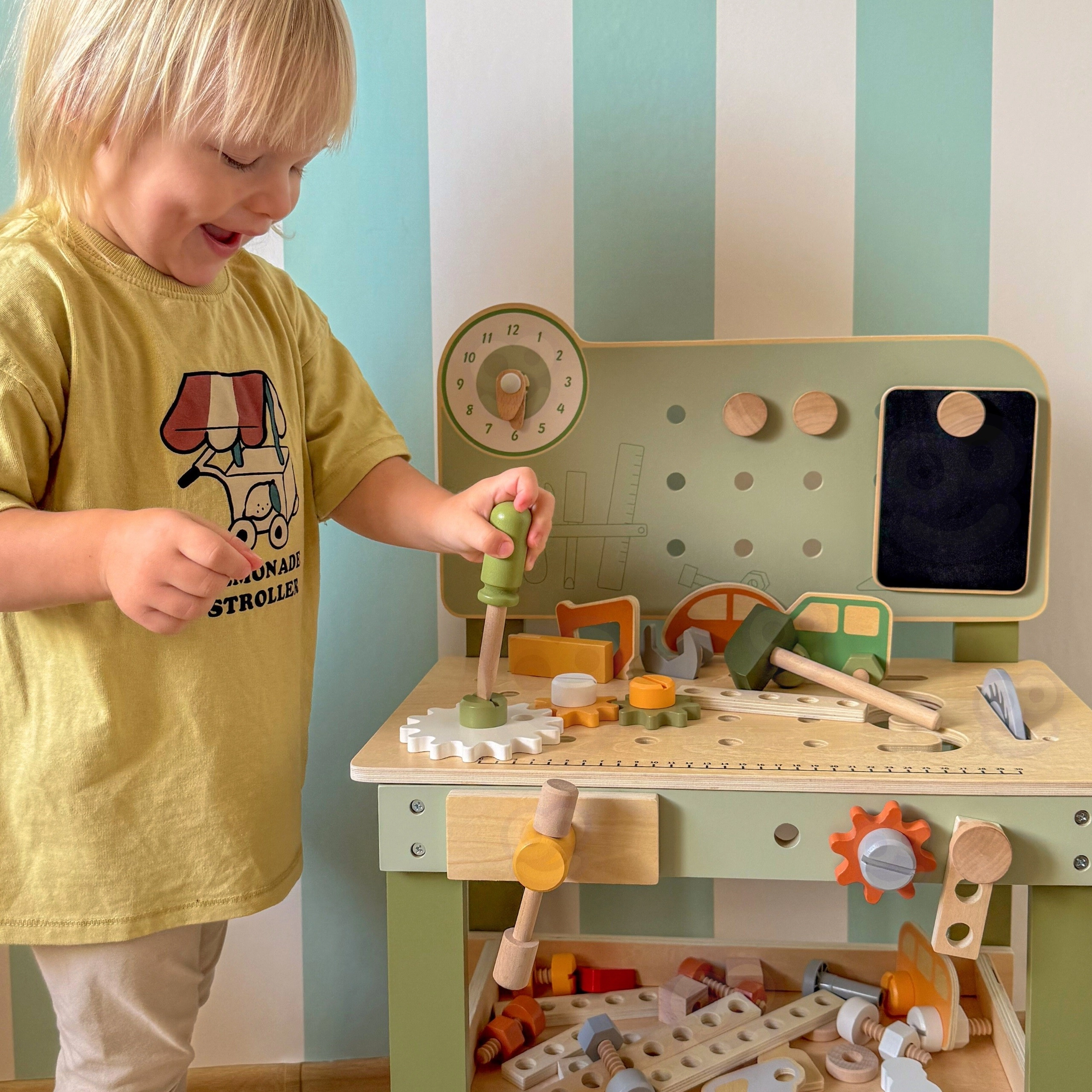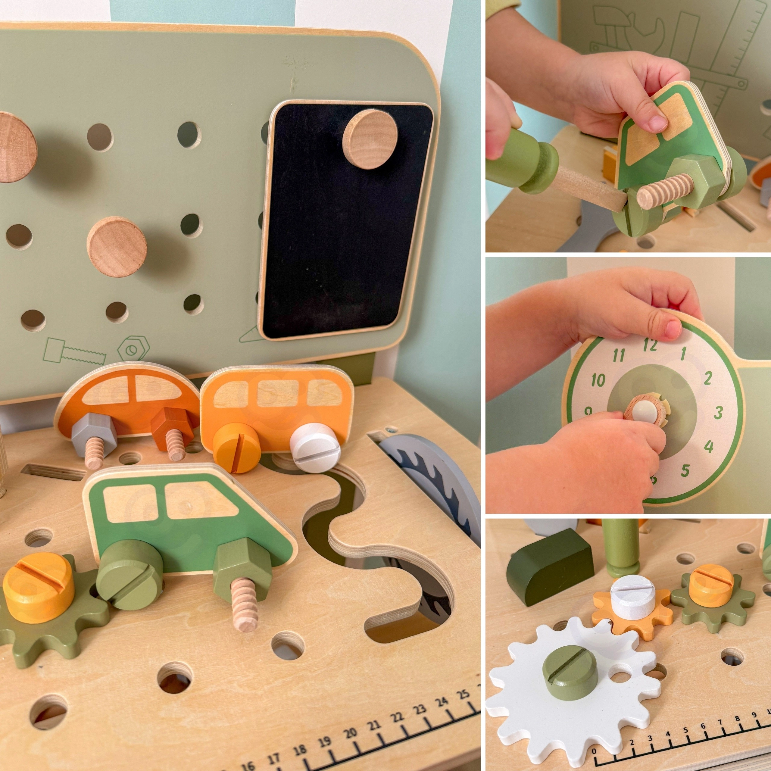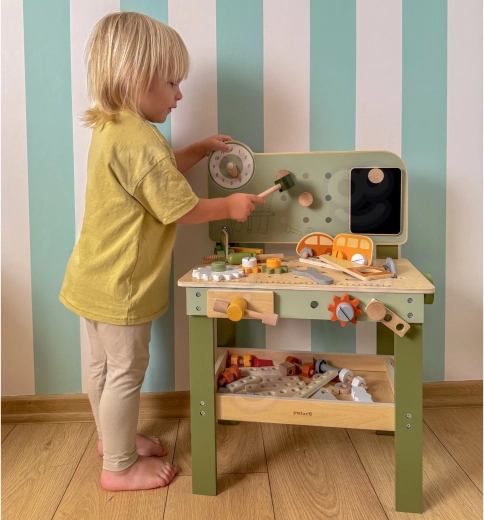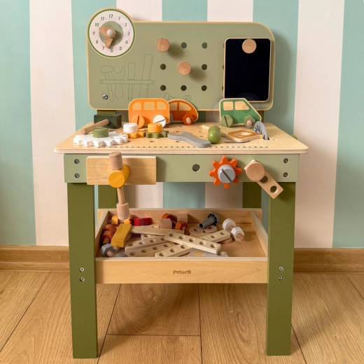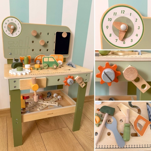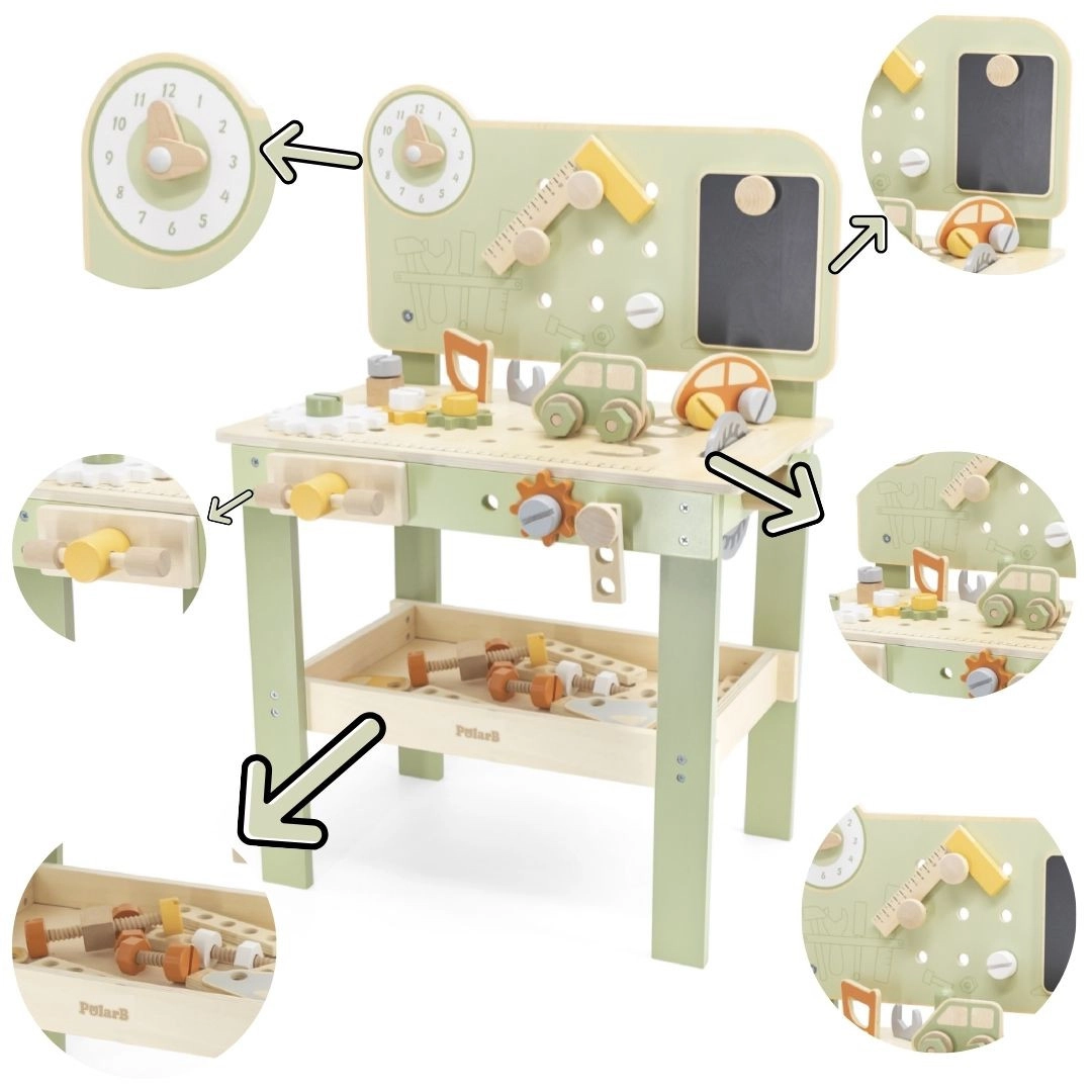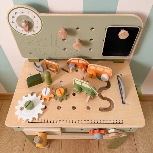 Zestaw zawiera narzędzia (młotek, klucz, śrubokręt), śrubki, nakrętki, koła zębate, panel z zegarami edukacyjnymi oraz praktyczną półeczkę na odkładanie. Dzieci mogą tworzyć własne konstrukcje, „naprawiać” i sortować części – idealne do rozwoju kreatywności, cierpliwości i planowania.