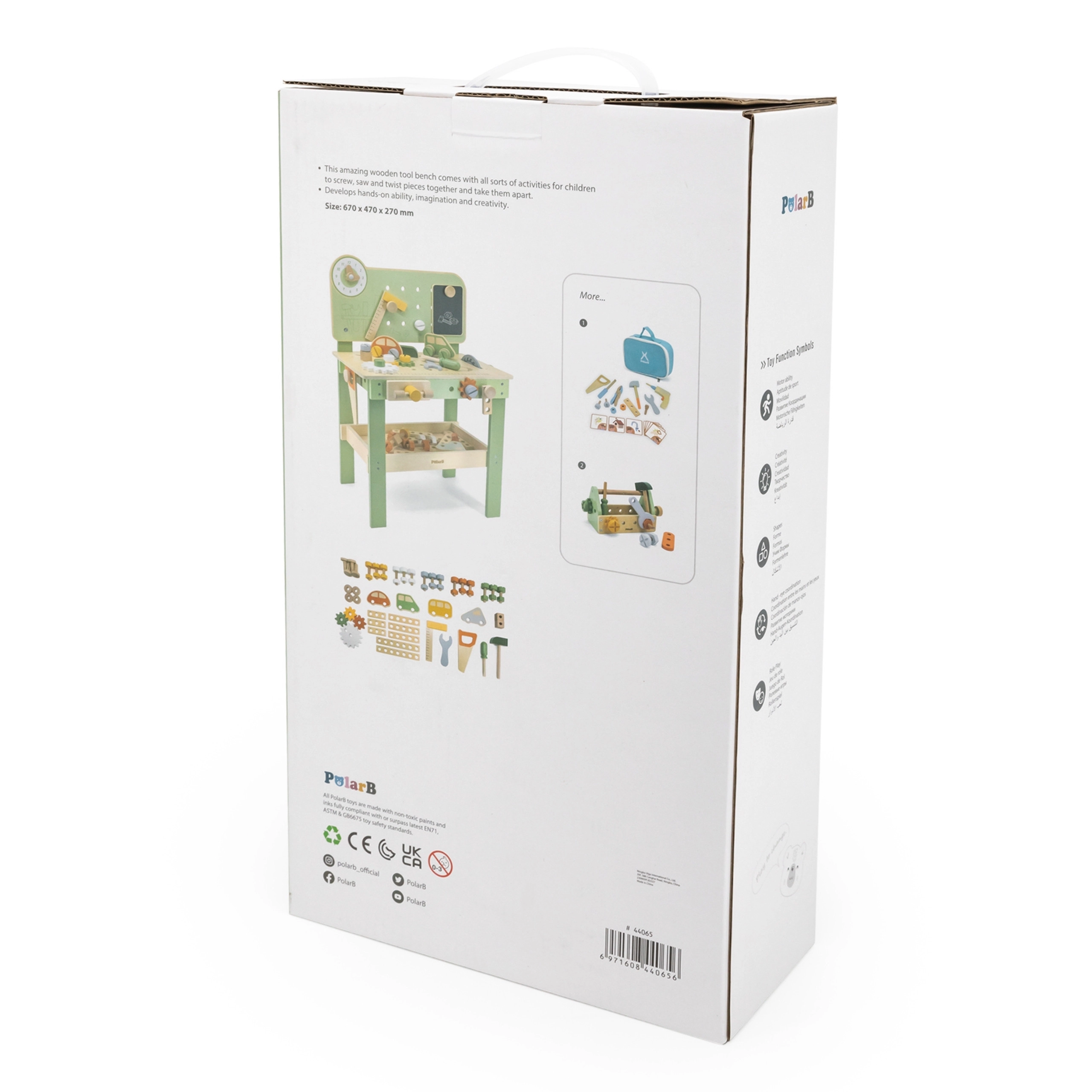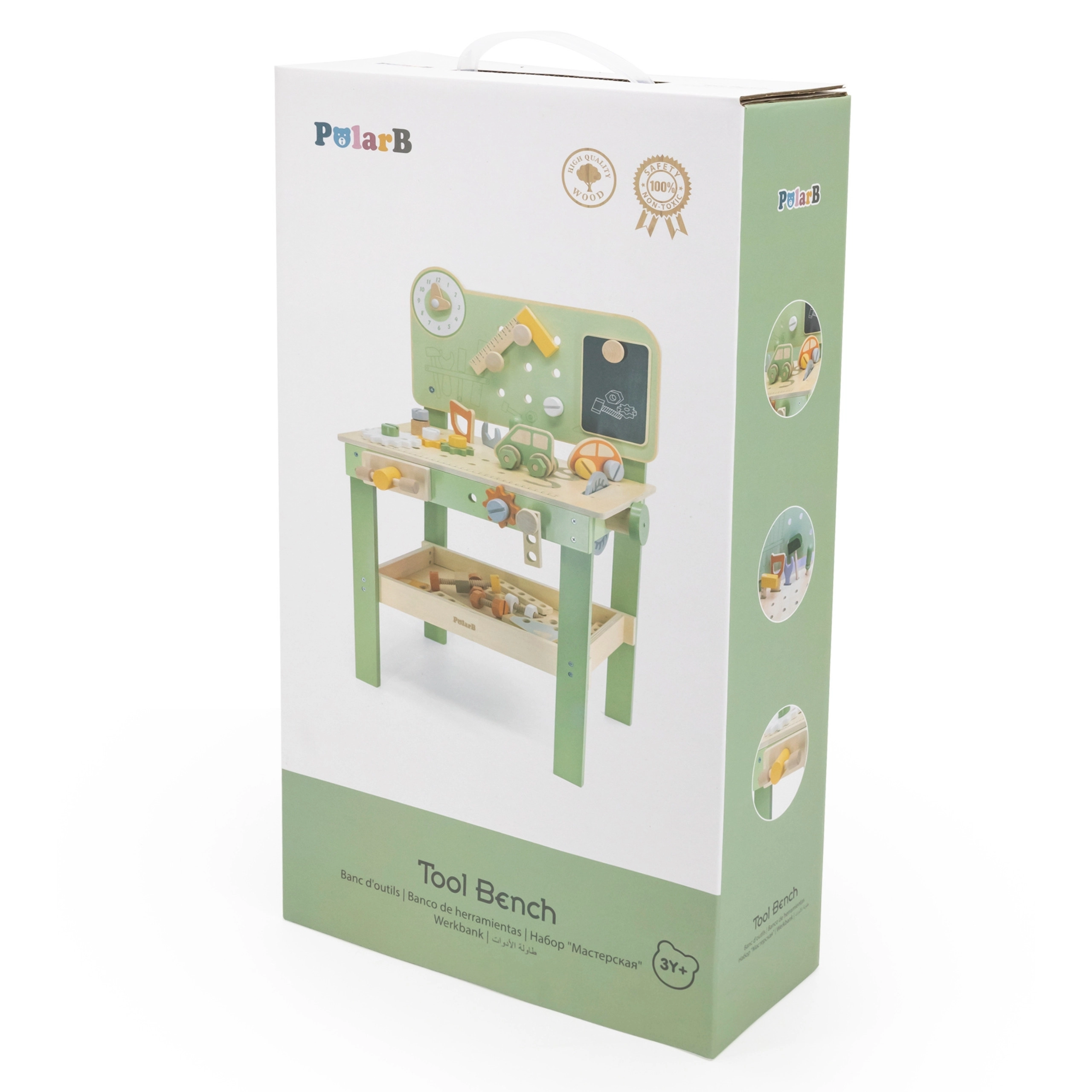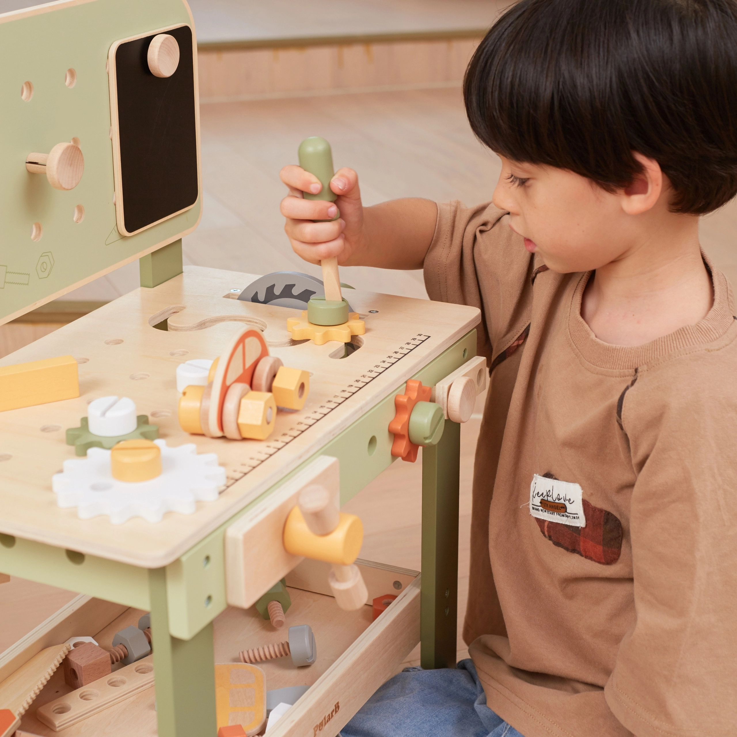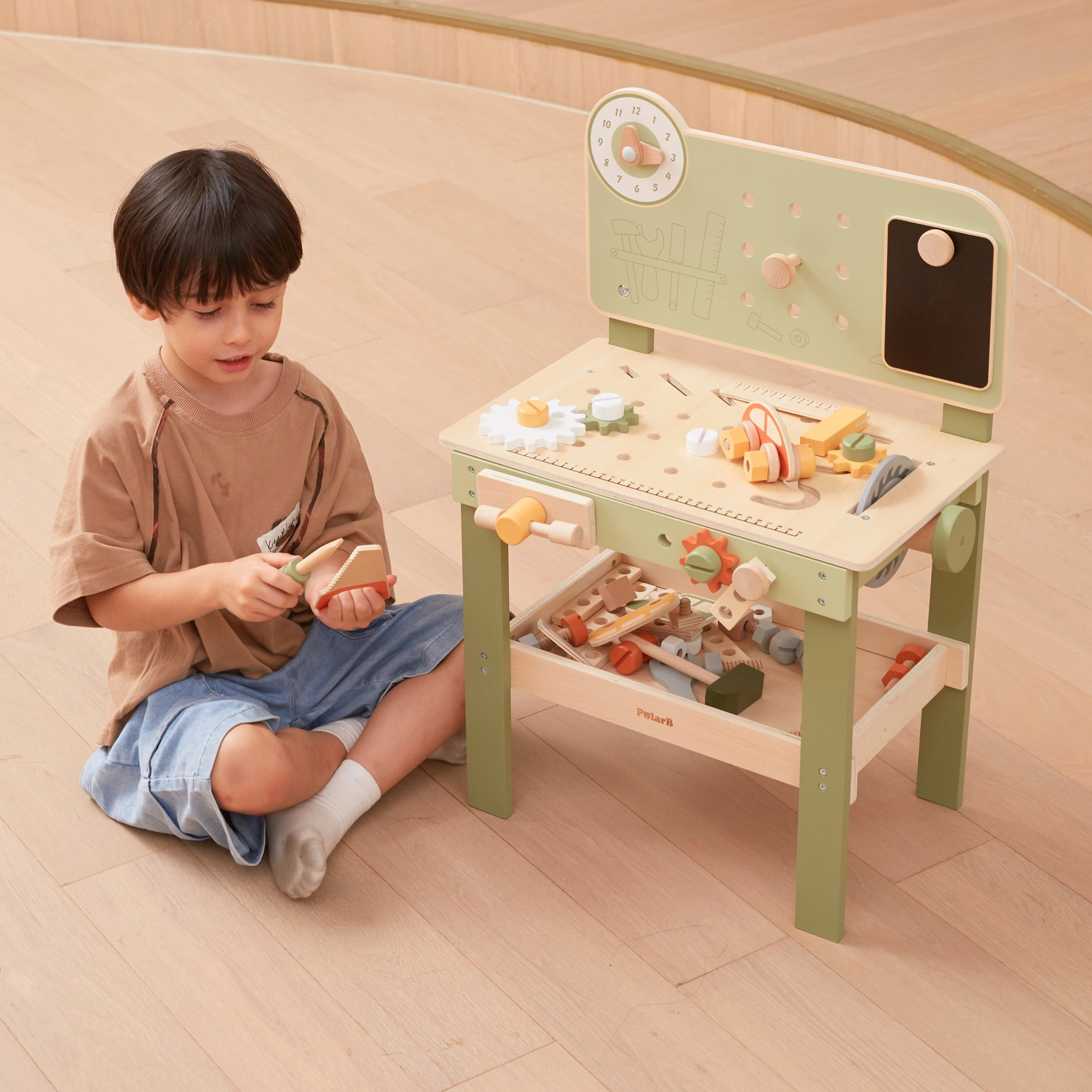 Solidne drewno z nietoksycznymi farbami oraz dolna półka na elementy zapewniają bezpieczną i uporządkowaną zabawę.