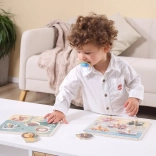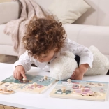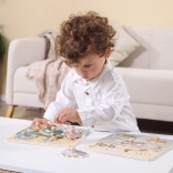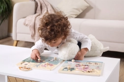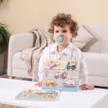 Drewniana układanka z motywem środków transportu. Wymiary drewnianej planszy ok. 22 × 22 cm. Wymiary opakowania ok. 22 × 22 × 2,5 cm. Wiek 18 m+