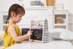 W zestawie znajduje się mała tablica oraz bezpyłowa kreda do pisania cyfr, pierwszych działań i własnych obrazków – idealna do rozwijania kreatywności.
