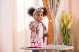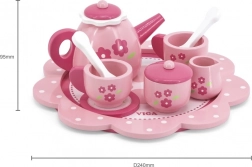 Zestaw zawiera wszystko, co potrzebne do zabawy w herbatkę: czajnik, dzbanek, cukiernicę, filiżanki, spodki, łyżeczki i tacę.