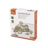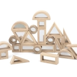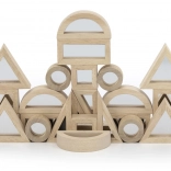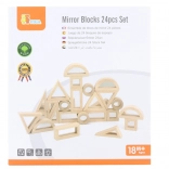Zestaw zawiera 24 drewniane, dwustronne klocki z lusterkami, które pomagają dzieciom rozwijać koordynację ręka-oko oraz umiejętność rozpoznawania różnych kształtów. W opakowaniu znajduje się sześć różnych kształtów, w tym prostokątne, kwadratowe, okrągłe, prostokątne trójkąty, trójkąty równoboczne i półokręgi. Dzięki lusterkom dzieci rozwijają również poczucie własnego "ja", co zwiększa ich pewność siebie.