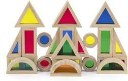 Klocki dostępne są w różnych kształtach i kolorach, co wspiera rozpoznawanie barw i form oraz percepcję wzrokową.
