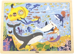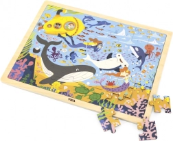 Z drewnianymi puzzlami Życie morskie odkryjesz niezwykłą paletę morskich stworzeń, takich jak wieloryby i rybki, a to wszystko wraz z żółtą łodzią podwodną.