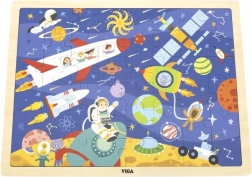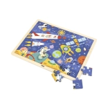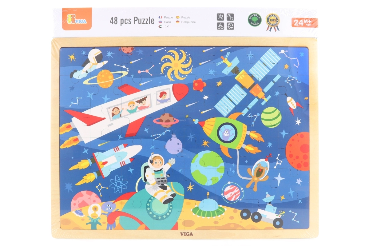 Ta wysokiej jakości drewniana układanka z 48 elementami oferuje dzieciom wciągającą przygodę w kosmosie. Kolorowe ilustracje planet, rakiet i astronautów utrzymują uwagę i wspierają naturalną ciekawość. Puzzle są umieszczone w solidnej drewnianej ramce, która ułatwia układanie i przenoszenie.