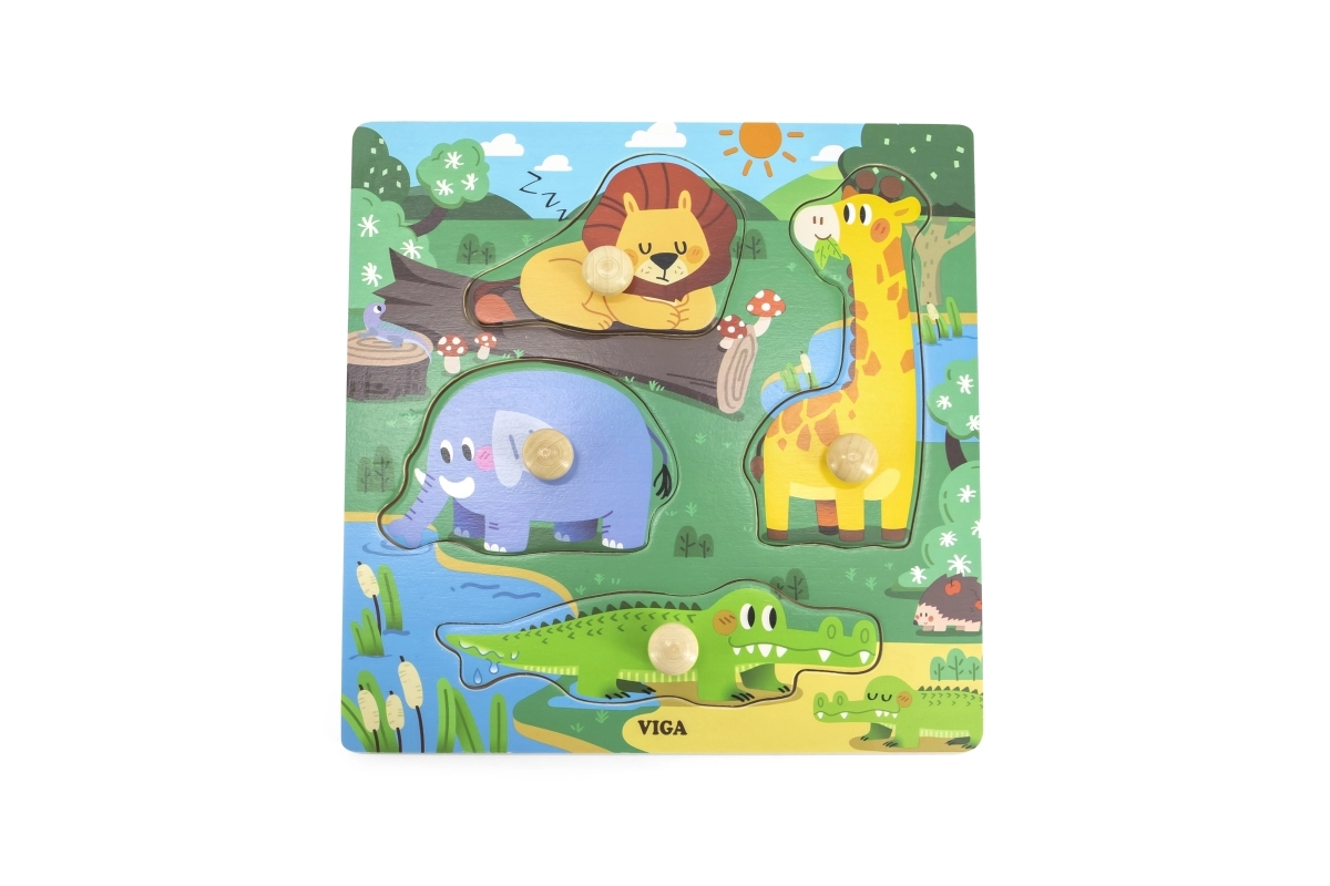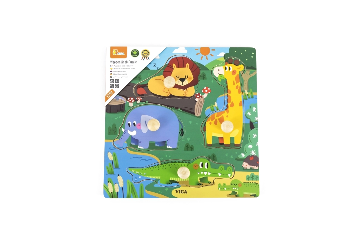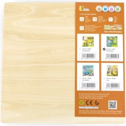 Drewniana układanka z dzikimi zwierzętami. Wymiary drewnianej planszy ok. 22,5 x 22,5 cm. Wymiary opakowania ok. 22,5 x 25,5 x 1 cm. Wiek 12m+