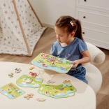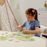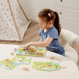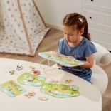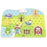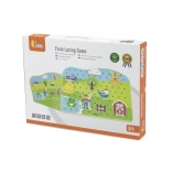 Ta przewlekanka o tematyce farmy to idealna pomoc w rozwoju umiejętności przedszkolaków. Dzieci, kierując się wzorami lub własną wyobraźnią, przewlekają sznureczki przez kolorowe drewniane elementy, wzmacniając palce, poprawiając chwyt i przygotowując się do pisania oraz rysowania.