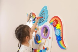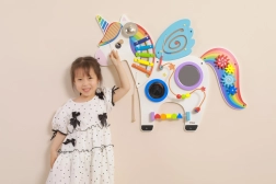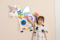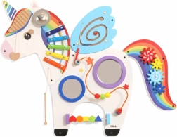 Ta multifunkcyjna tablica ścienna w formie jednorożca łączy elementy muzyczne, dotykowe i logiczne w jedną atrakcyjną całość. Dzieci zagrają na ksylofonie, zakręcą kołami zębatymi, wypróbują magnetyczny labirynt i lusterka, a także poćwiczą rozpoznawanie kolorów, kształtów i koordynację ruchów.