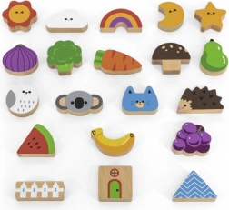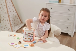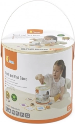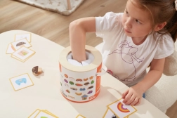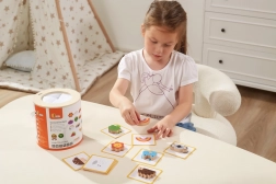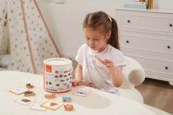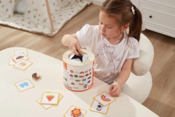Gra Złap i znajdź. Zestaw zawiera 20 klocków, papierowe wiaderko, 20 kart do gry oraz pokrywkę. Wymiary opakowania ok. 16 × 15,5 cm. Wiek 3+
