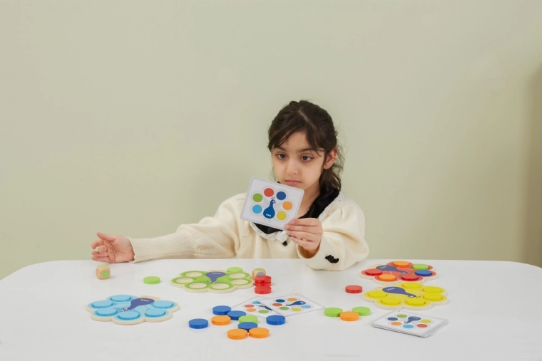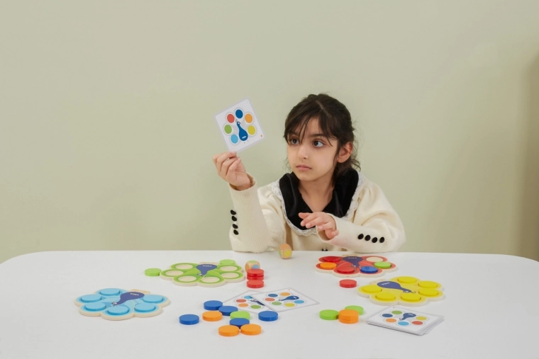Dzieci dopasowują krążki według kart lub wyniku rzutu kostką, naturalnie przyswajając kolory oraz trenując uwagę i logiczne myślenie.