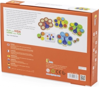 Edukacyjna gra dla dzieci VIGA paw w przystępny i zabawny sposób uczy rozpoznawania kolorów, rozwija małą motorykę oraz koordynację wzrokowo-ruchową. Kolorowe krążki wkłada się w ogon pawia według kart lub zgodnie z wynikiem rzutu kolorową kostką – idealne do nauki metodą Montessori, ćwiczenia koncentracji i wspólnej zabawy.