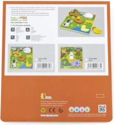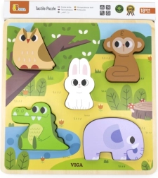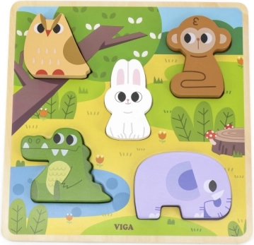 Drewniana układanka VIGA z leśnymi zwierzątkami to idealne pierwsze puzzle dla najmłodszych. Zadaniem jest poprawne dopasowywanie kształtów zwierząt do wyznaczonych otworów na kolorowej podstawie. Elementy wygodnie leżą w rączkach, a solidna drewniana konstrukcja zapewnia długie użytkowanie.
