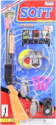 Plastikowy karabin na naciąg, 4× strzałka z przyssawką, 2× granat (ok. 9 cm), krótkofalówka, kajdanki, odznaka, tarcza (ok. 13,5 × 8 cm)