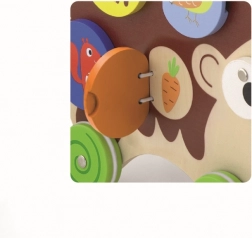 Liczenie, przesuwany labirynt ze zwierzątkami, kulkowy labirynt, koła zębate oraz edukacyjne obrotowe elementy – wszystko w jednej zabawce na długie godziny odkrywania.