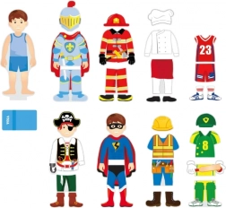 Ta magnetyczna przebieranka daje dzieciom nieskończone możliwości łączenia fryzur, nakryć głowy i elementów ubioru. Magnetyczna figurka chłopca stoi na stabilnej podstawie, dzięki czemu łatwo się nią manipuluje, a przebieranie jest intuicyjne i wciągające.