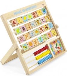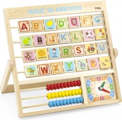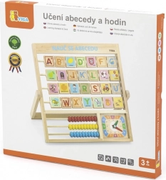 Drewniany alfabet i zegar w języku czeskim. Dzieci mogą uczyć się liter, liczb oraz zdobyć ogólne pojęcie o odczytywaniu godziny. Każda litera ma na odwrocie słowo ułatwiające zapamiętywanie. Wymiary ok. 32,5 x 32 x 2,3 cm. Wymiary opakowania ok. 34 x 32,5 x 3 cm. Wiek 3+