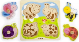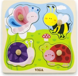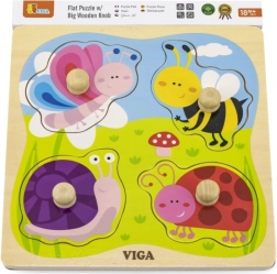 Drewniana układanka VIGA z 4 dużymi elementami z uchwytami to idealne pierwsze puzzle dla najmłodszych. Kolorowe motywy owadów i zwierzątek z łąki naturalnie motywują dzieci do odkrywania i nauki. Frezowane krawędzie na solidnej drewnianej podstawie pomagają, by każdy element pewnie trzymał się na swoim miejscu.