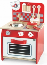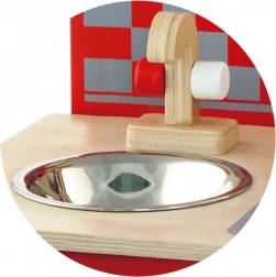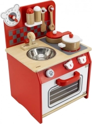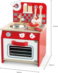 Dzięki wysokiej jakości drewnianemu wykonaniu ta kuchnia jest nie tylko trwała, ale także estetycznie przyjemna. W zestawie znajdują się także akcesoria do zabawy, takie jak łyżka, chochelka, garnek z pokrywką, patelnia z pokrywką i dwie przyprawy.