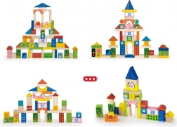 Zestaw zawiera klocki różnej wielkości, od 2,5 cm do 7,5 cm, co pozwala dzieciom tworzyć różne budowle, takie jak domy, mosty i inne miejskie elementy. Dzięki wytrzymałemu drewnianemu materiałowi klocki są odpowiednie do długotrwałej i bezpiecznej zabawy.