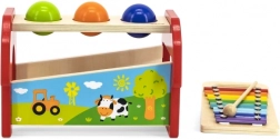 - podstawa z pojemnikiem na kulki, ksylofon, drewniany młotek, 3 kolorowe kulki