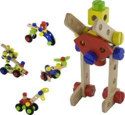 Ten drewniany zestaw konstrukcyjny to idealny wybór na pierwsze techniczne budowanie. Dzieci mogą tworzyć własne projekty według wyobraźni lub inspirować się dołączoną broszurą z obrazkowymi instrukcjami. Kompaktowe wiaderko z uchwytem ułatwia przenoszenie i przechowywanie, dzięki czemu zestaw jest zawsze pod ręką, a elementy się nie gubią.