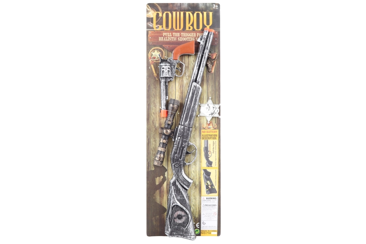 Zostań małym bohaterem Dzikiego Zachodu dzięki temu kompletnemu zestawowi kowbojskiemu. Zawiera plastikowy karabin z celownikiem, pistolet, odznakę szeryfa oraz brelok. Obie zabawki po naciśnięciu spustu wydają realistyczny dźwięk strzału i nie wymagają baterii. Idealny do zabawy w odgrywanie ról i rozwijania wyobraźni dzieci od 3 lat.