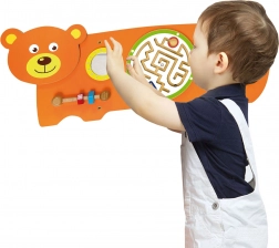 Tablica sensoryczna Miś została zaprojektowana zgodnie z zasadami Montessori tak, by naturalnie motywować dzieci do odkrywania i ćwiczenia umiejętności. Oferuje wiele aktywności: obracanie kół zębatych, prowadzenie kuleczki w labiryncie, obserwację w bezpiecznym lusterku oraz trening chwytu dzięki śrubkom na gwincie. Dzięki solidnej drewnianej konstrukcji i możliwości montażu na ścianie świetnie sprawdzi się w pokojach dziecięcych, salach zabaw i przedszkolach.
