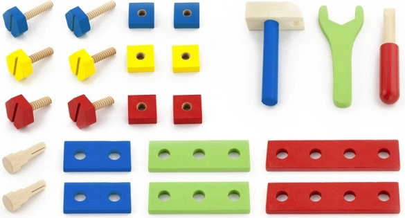 W skład zestawu wchodzą śrubokręt, młotek, klucz, śruby, nakrętki i płytki – idealne do naśladowania napraw i budowania.