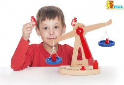 Drewniana waga balansowa marki Viga jest wyposażona w dwie niebieskie misy zawieszone na sznurkach i zawiera sześć czerwonych odważników o różnych rozmiarach. Dzięki swojemu kolorowemu designowi i bezpiecznemu wykończeniu ta waga dostarcza dzieciom wiele zabawy. Waga została zaprojektowana tak, aby motywować dzieci do używania wyobraźni i fantazji podczas zabawy w sklep, co pomaga im zrozumieć podstawowe koncepcje matematyczne i wartość równowagi.